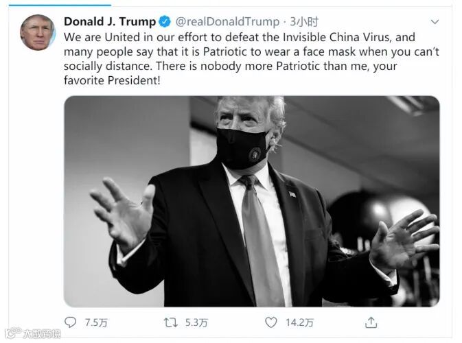 各州急忙搬出口罩令并非偶然。目前,美国社会对口罩的看法已经开始扭转。特朗普7月20日发推文说:“当你无法保持社交距离时,戴口罩就是爱国。”