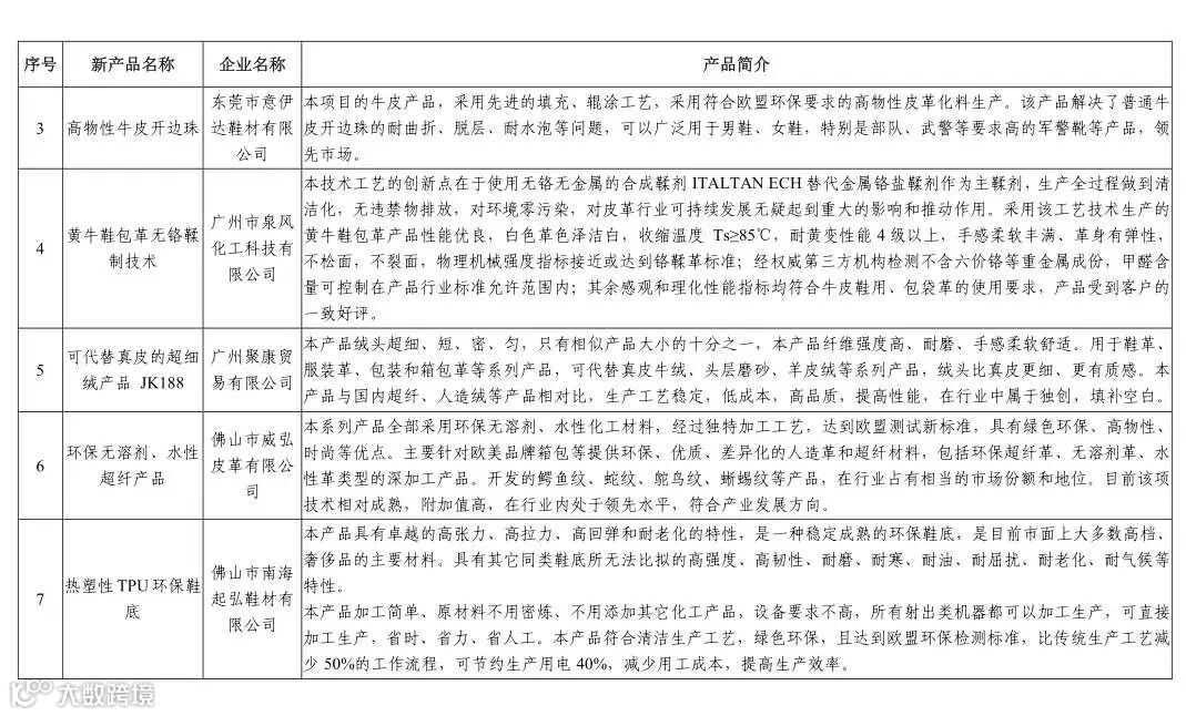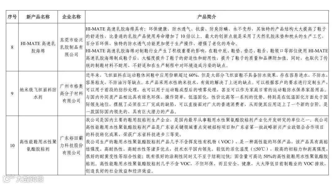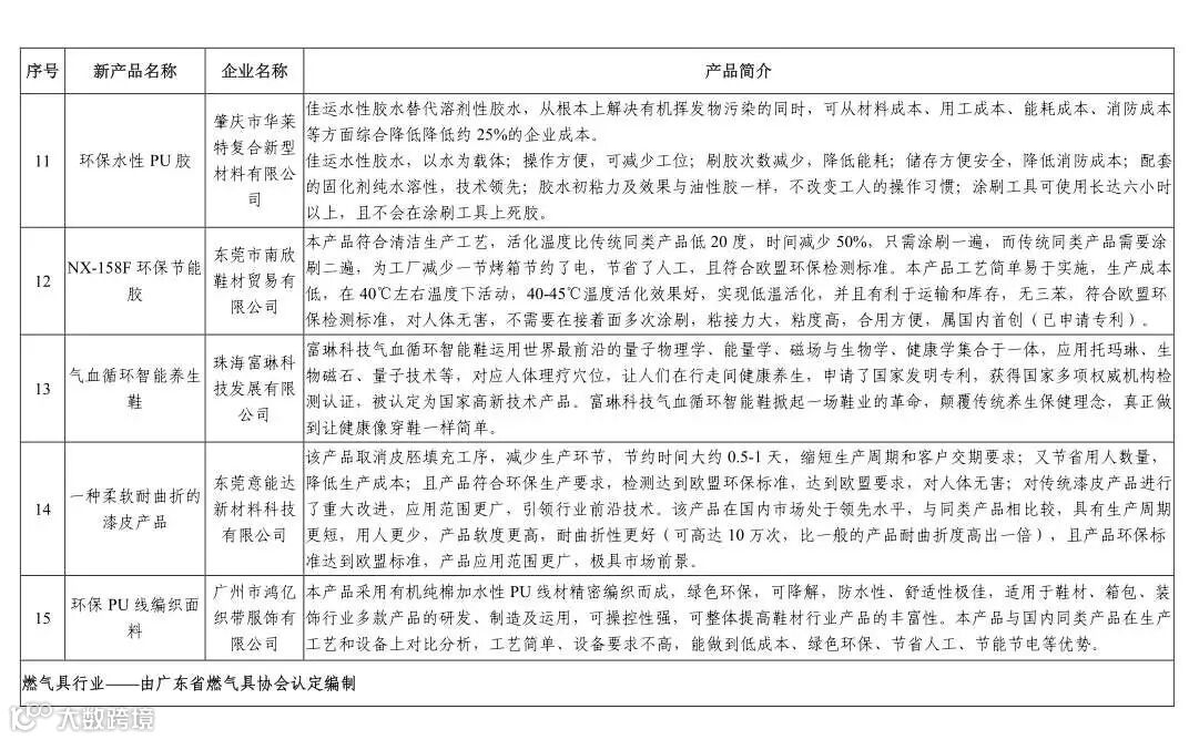 经我会推选评审、广东省工业和信息化厅公示,认定广州、东莞、佛山、肇庆等地15家企业的15项产品为2018广东鞋材行业新产品新技术,入选省工信厅《广东消费品供给指南》(第一批)。
