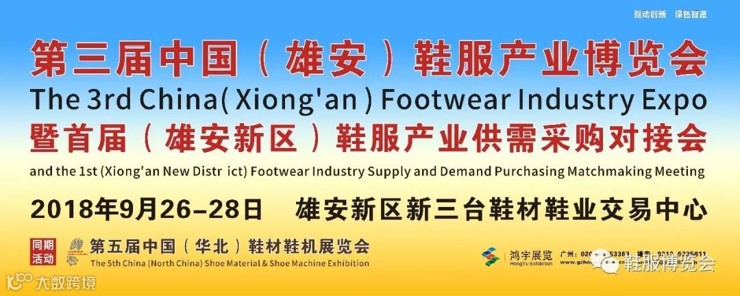 由河北省皮革行业协会、安新县制鞋行业协会、新三台鞋材鞋业交易中心、广州鸿宇展览有限公司等单位牵头筹备,以“驱动创新、绿色智造”为主题的“第三届中国(雄安)鞋服产业博览会暨首届(雄安新区)鞋服产业供需采购对接会”将于2018年9月26至9月28日在雄安新区新三台鞋材鞋业交易中心隆重举办。