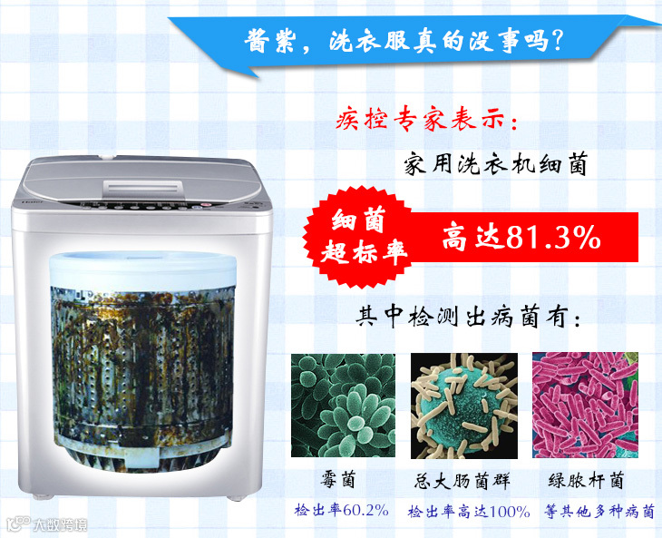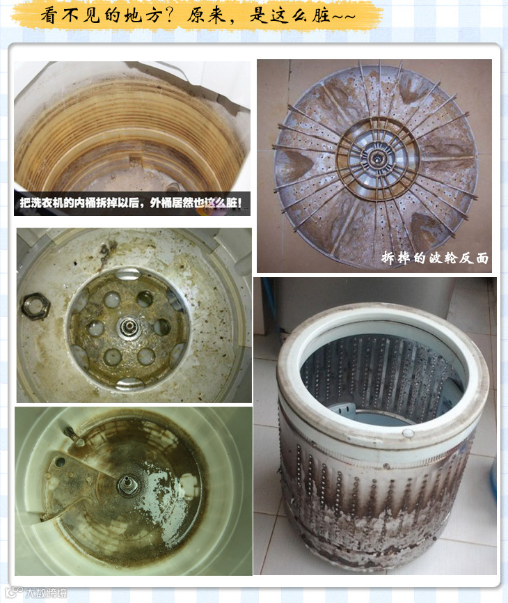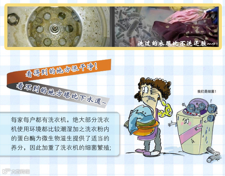 手洗衣服洗不干净,也懒的洗,总是依靠洗衣机,但你家的洗衣机真的能洗干净衣服吗?看的见的地方是干净的,看不见的地方堪比下水道,你每次洗衣服就好比用下水道的水在洗,你造吗?洗完衣服,看的见的地方总是冲的干干净净的,看不见的地方,细菌在潮湿的环境下日积月累的肆意横生;洗衣机里面不干净,不管你用多好的洗衣液,洗衣粉都是白搭;