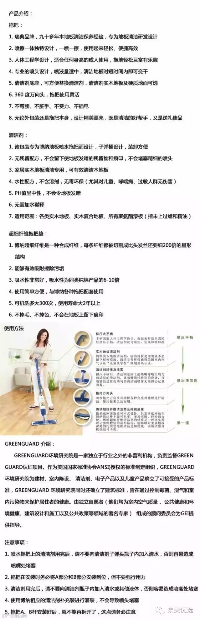 它将无残留久耐用的高品质量超细纤维布综合在一起 喷擦一体-清洁地板 一手即可。专业的喷头设计-适中的喷量 清洁的同时使地板在短期内变干。配备博纳专业无残留清洁剂-不会使精细的喷头被堵塞。人性化设计-从握柄到拖把长度 适用于任何身高的成人拖地更轻松。将是用户选择清洁工具时的最终选择!