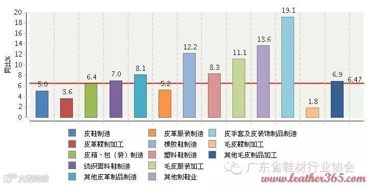 图3 2015年1~6月全国皮革行业累计主营业务收入行业小类同比增长情况