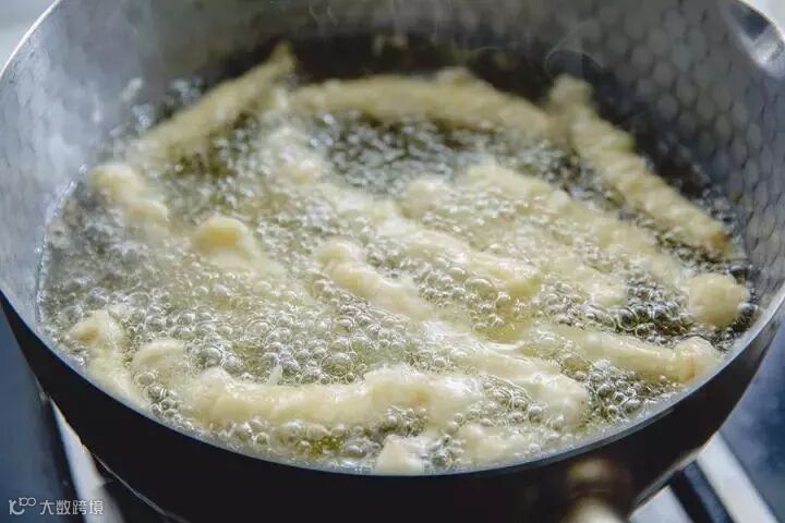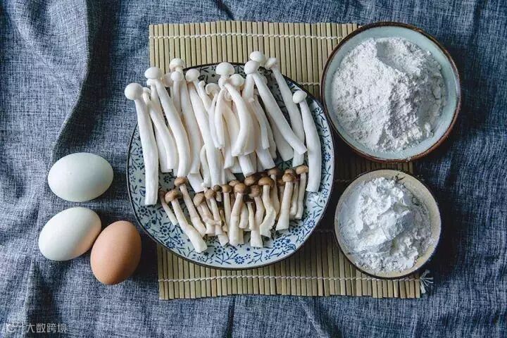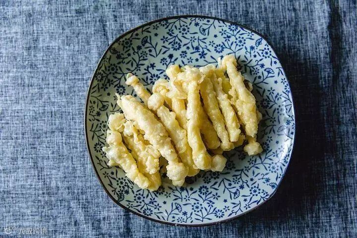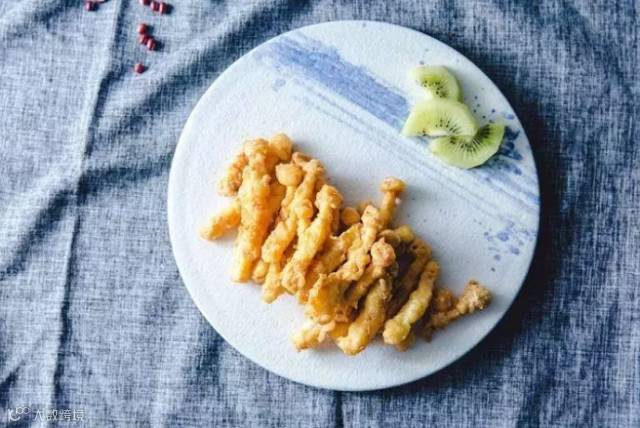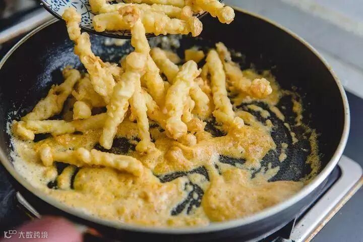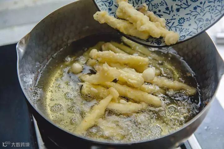 5. 油炸:油锅五六成热(看到油面微微翻动,但没有烟),依次放入挂糊后的菌菇,进行油炸。炸到外壳凝固、颜色稍变就可以捞起来了。