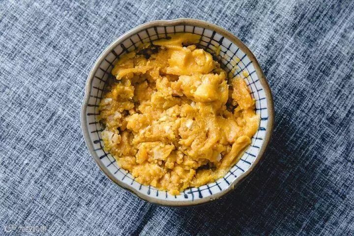 剥出三颗咸鸭蛋黄,用勺子背碾碎待用。