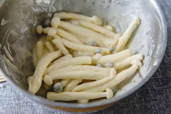 接着放入擦干水分的菌菇,用筷子拌匀,让每个菌菇都均匀裹上面糊。
