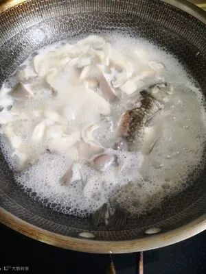 4:加葱料酒大火烧开小火慢炖20分钟,后加入平菇,大火烧3分钟。