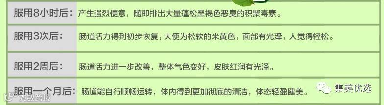 胃肠道活力得到恢复提高,服用8小时后,产生强烈便意,随即排出大量蓬松褐色恶臭的积聚毒素