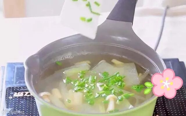 煮约3分钟冬瓜完全透明,加点葱叶碎,再加点盐,