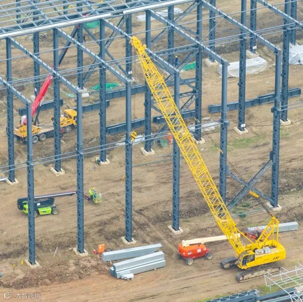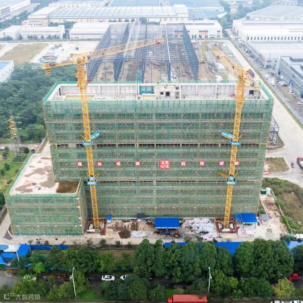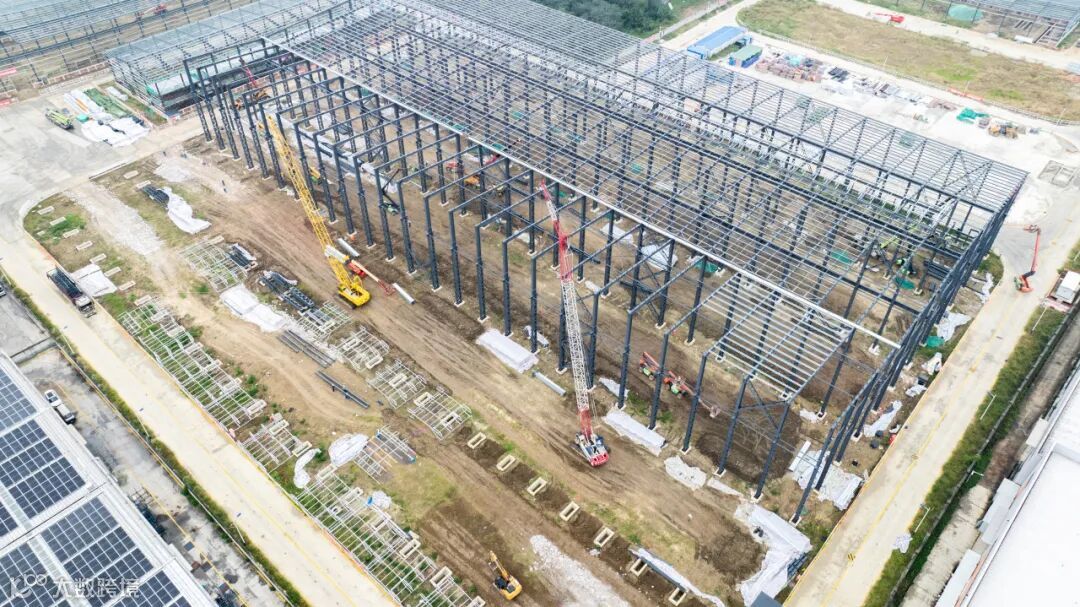 自2024年10月正式破土动工以来,项目全速推进,建设现场日新月异。目前,研发大楼已完成主体封顶,正在开展二次结构施工;厂房正在开展主体钢结构安装作业。
