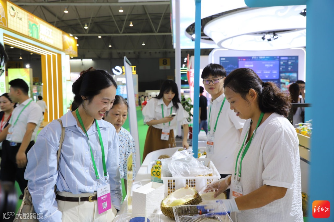 ▲9月4日,第十一届成都国际都市现代农业博览会8号馆青白江展区,来自泰国的金枕榴莲深受消费者喜爱。