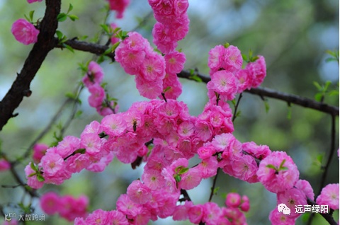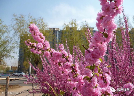 榆叶梅的叶片像是榆树叶,花朵又像是梅花,所以得名“榆叶梅”,枝叶茂密,花繁色艳,宜植于公园草地、路边,或庭园中的墙角、池畔等。