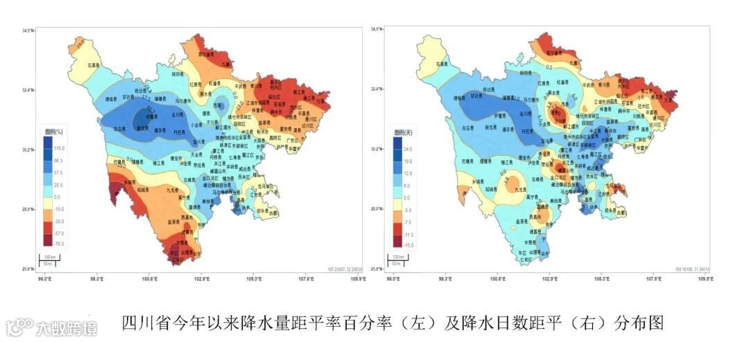 气象监测显示,今年以来,四川降水量和降水日数均偏多。截至5月12日,全省平均降水量152.0毫米,较常年同期偏多3%,其中川西高原中部的炉霍、新龙、茂县、金川、丹巴等县站偏多8成~1倍;全省平均降水日数48天,较常年同期偏多5天,其中茂县、金川、简阳、炉霍、仁寿、三台、高坪7县站降水日数为历史同期最多。
