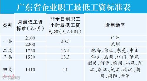 从2018年7月1日起,对广东省企业职工最低工资标准和非全日制职工小时最低工资标准进行调整。其中,广州最低工资标准调整为2100元/月,非全日制职工小时最低工资标准调整为20.3元/小时。