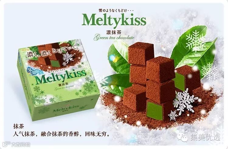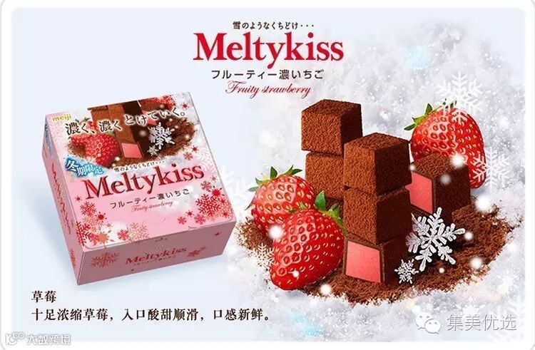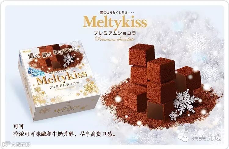 Meltykiss雪吻是日本明治制果的巧克力主打系列,极受吃货们的喜爱。冬之吻,巧克力像雪一样入口即化。一瞬间,让你仿佛置身轻盈洁白的冰雪世界,欣享柔软与甜蜜。