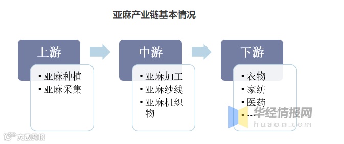 亚麻产业链上游部分主要是亚麻种植和采集的原料部分,中游则主要是亚麻的初加工和亚麻纱线、亚麻机织物等主要亚麻制品,下游部分则是亚麻产业的具体应用部分,包括服装、家纺、医药用品和其他纺织品等。