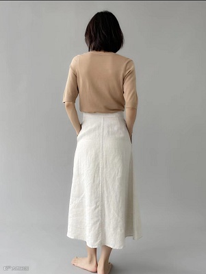 奶茶色亚麻清新自然的温柔感,与各类单品总是完美契合,它也可以穿的很干练,这样一件A字版裙子,搭配一件卡其色毛衫,就很适合通勤啦,上身效果无论是前面还是后面,都显得优雅中带着力量。