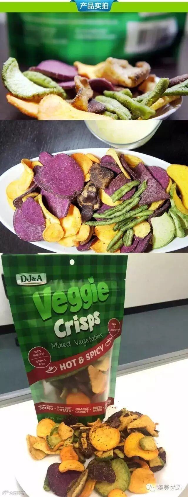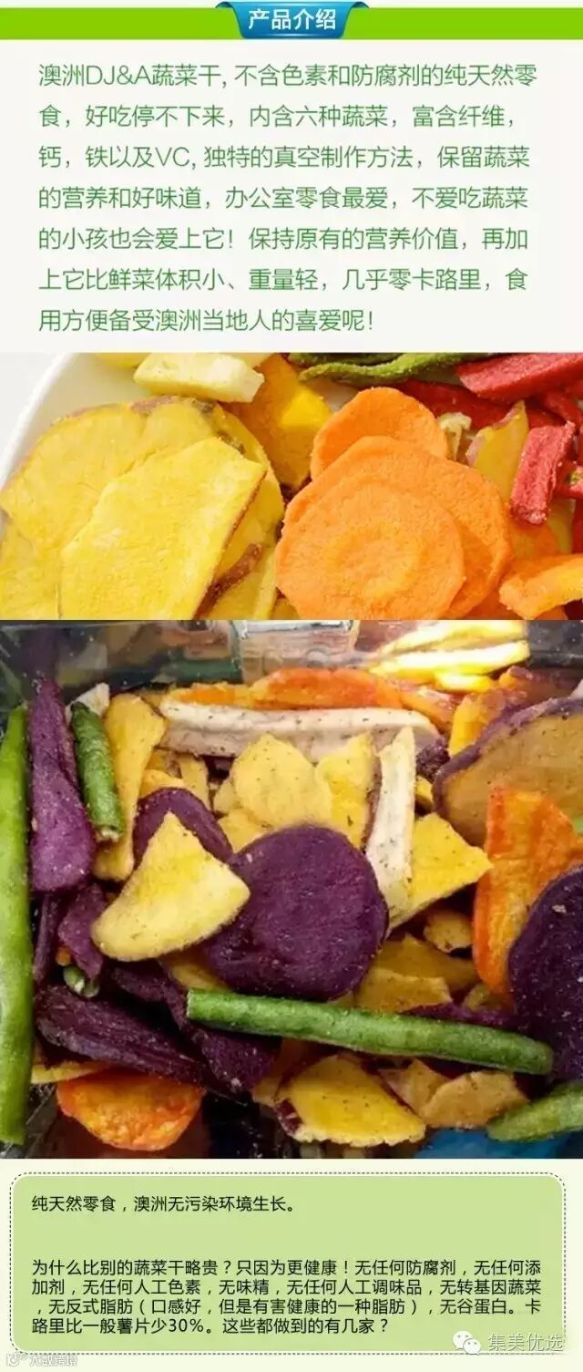 【产品特点】不含色素和防腐剂的纯天然零食。由六种有机健康蔬菜搭配制成,不含色素、防腐剂等,真正纯天然食品,食用时不单味美、色鲜,而且能保持原有的营养价值,再加上它比鲜菜体积小、重量轻,几乎零卡路里,食用方便。