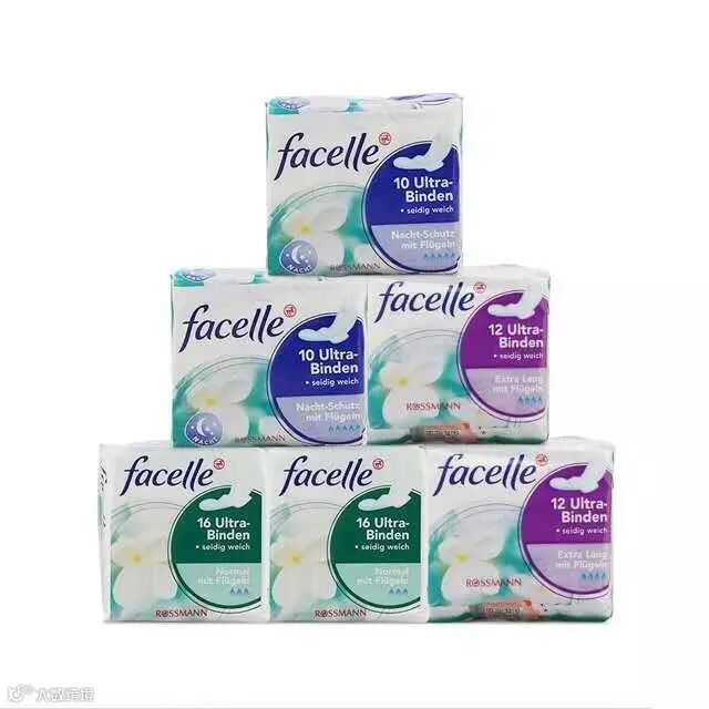 德国原装进口facelle卫生巾,真正的超薄超干爽,比护垫还薄,吸力却超强,无荧光剂。绵柔亲肤,带护翼防侧漏,性价比超高。最近卫生巾屡出问题,果断决定换掉。