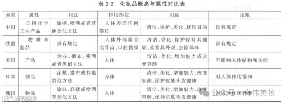 对不同国家化妆品定义与属性进行横向比较,便于我们理解同一类产品在不同国家的法规管理模式和归属,从而理解各国产品管理范围和产品管理方式不同的重要原因。