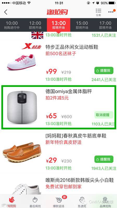OMIYA微健康OMIYA不锈钢体脂秤今日13:00淘抢购首秀,原价98元/台,抢购价65元/台,拍两台再减5元!!!!!