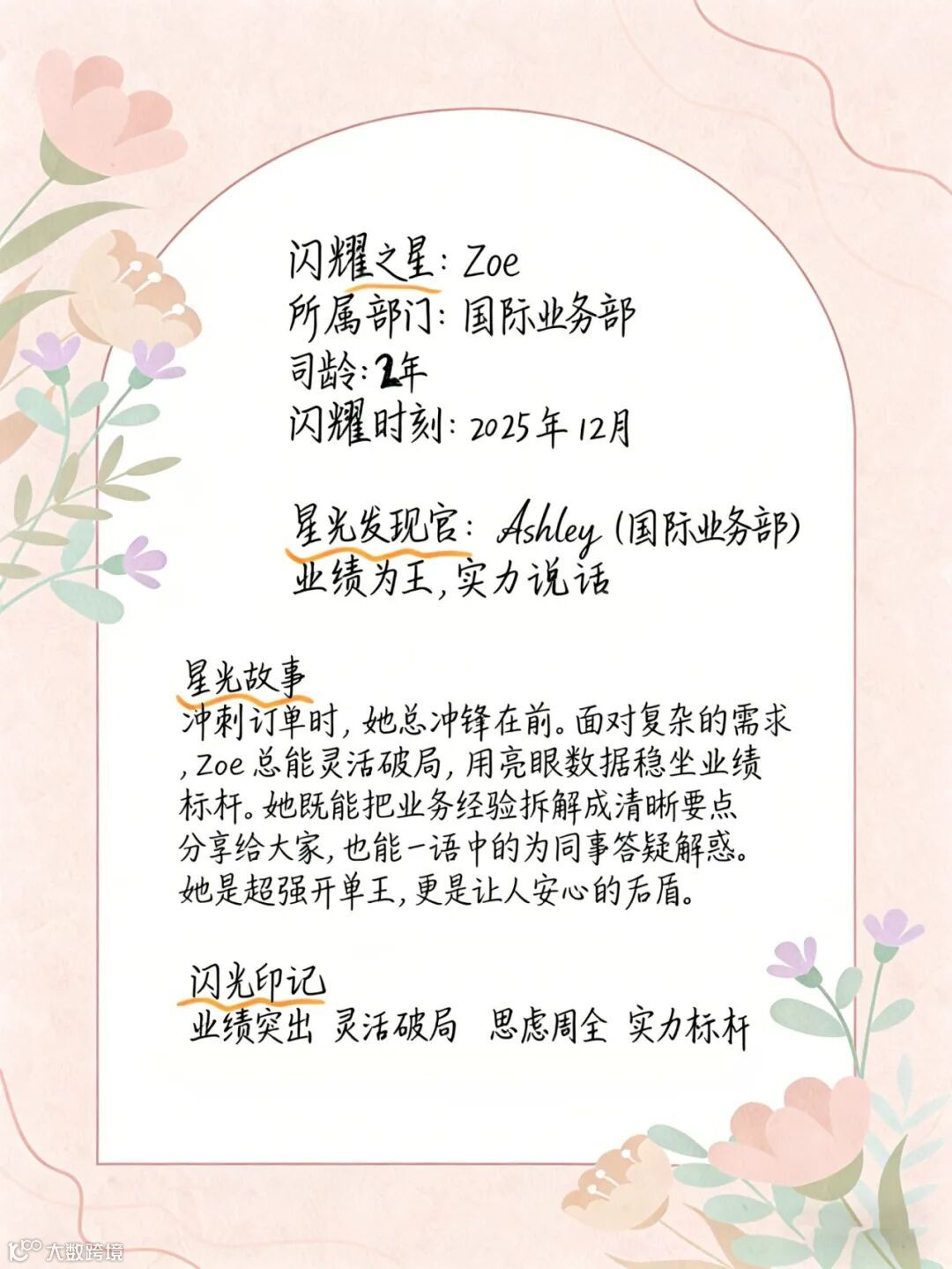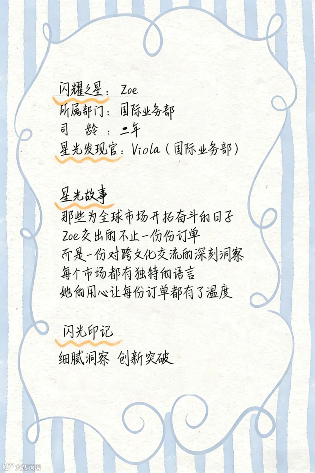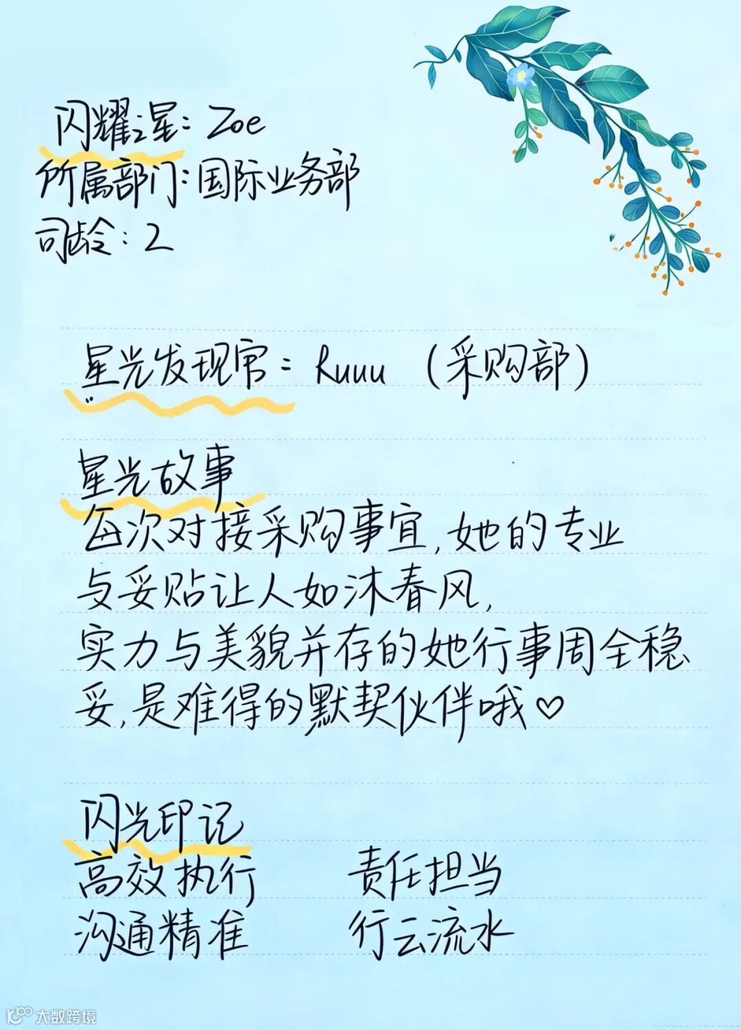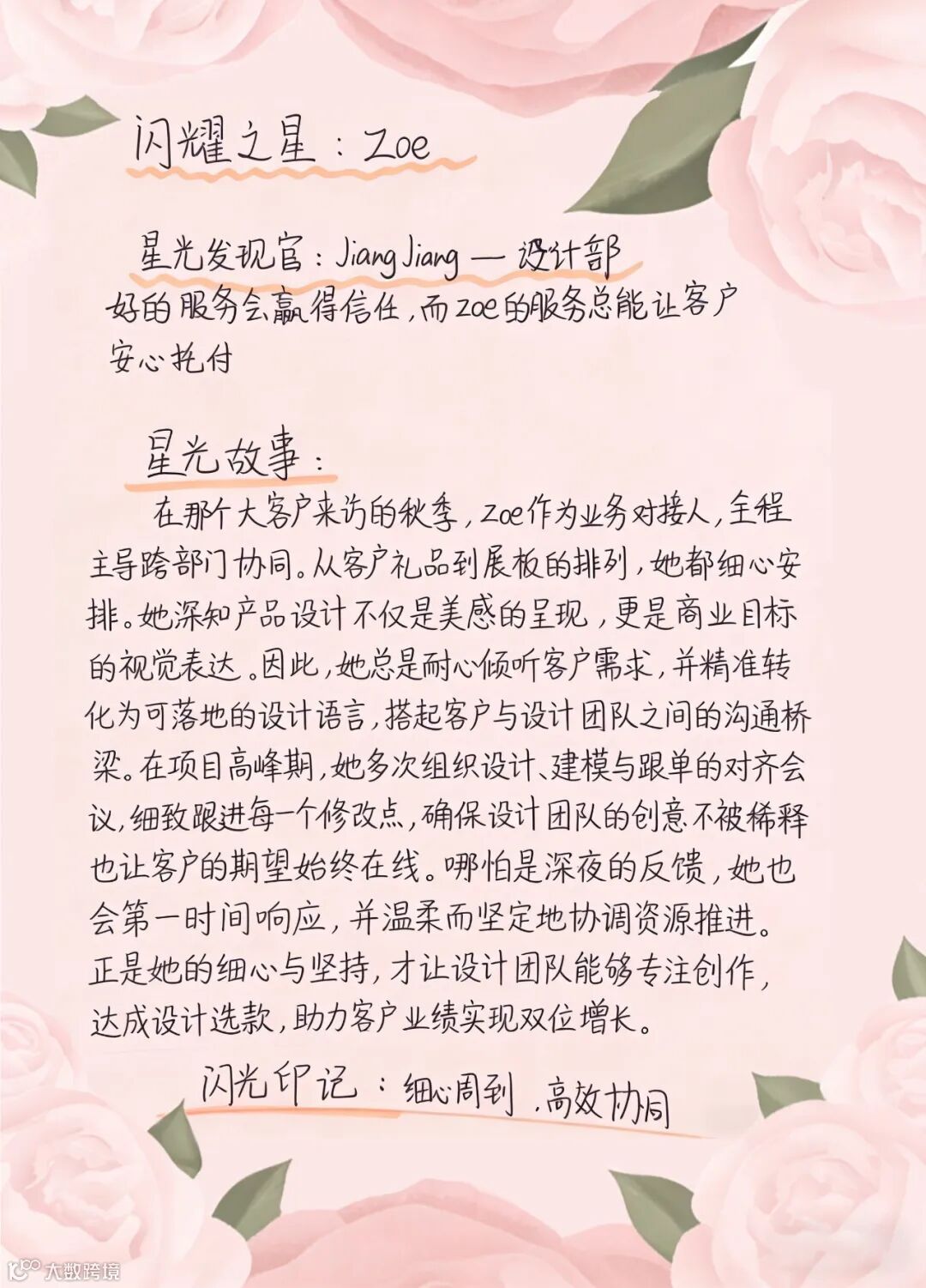 身边的同事纷纷化身“星光发现官”,用笔记录下Zoe在日常工作中的温暖片段与闪光印记。