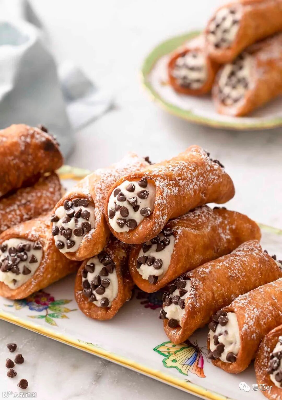 Cannoli (脆的管状酥皮糕点,以做糕点用的蛋奶糊或甜乳清奶酪填馅,用水果蜜饯和巧克力调味)