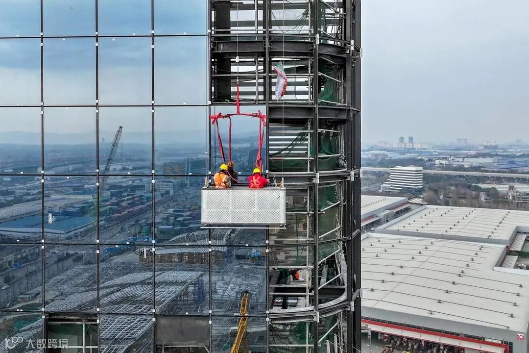 ▲1月5日,“一带一路”进出口商品交易展示中心项目建设现场,工人正在安装玻璃幕墙。