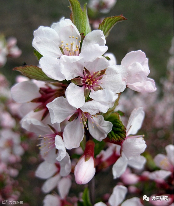 乔木或灌木,高2-25米,树皮灰白色或黑褐色。小枝灰褐色或灰棕色,嫩枝绿色,无毛或被疏柔毛。冬芽卵状椭圆形,无毛。叶片卵形、椭圆形或长圆状卵形,先端骤尖或短渐尖,基部圆形或楔形。花序伞形,有花3-4朵,花叶同开;花梗长0.8-3.4厘米,被疏柔毛或无毛;萼片三角卵圆形或卵状长圆形,先端圆钝或急尖;花瓣白色或粉红色,倒卵形。核果近球形或卵球形,呈红色至紫黑色,直径0.9-2.5厘米。花期3-5月,果期5-9月。