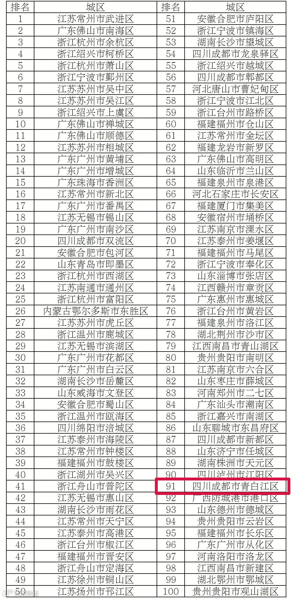 近日,2025年中国中小城市高质量发展指数研究成果发布,并揭晓了2025年度全国综合实力百强县市、2025年度全国综合实力百强区等多个榜单。其中,青白江区在“2025年度全国投资潜力百强区”中排名第65位,在“2025年度全国科技创新百强区”中排名第91位。