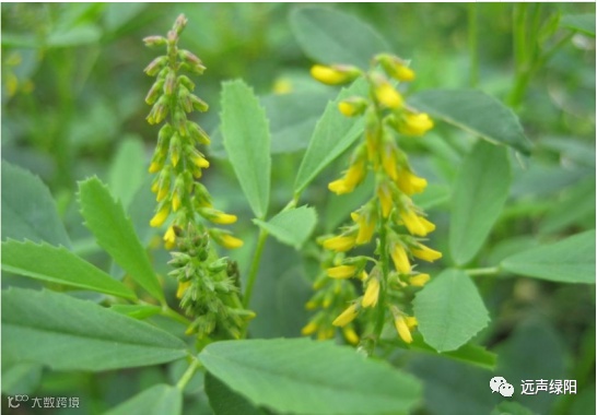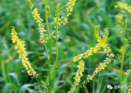 草木樨属二年生草本植物,高可达250 厘米。茎直立,粗壮,多分枝,三出羽状复叶;托叶镰状线形,叶柄细长;小叶片倒卵形、阔卵形、倒披针形至线形,上面无毛,粗糙,下面散生短柔毛,顶生小叶稍大;总状花序腋生,具花,初时稠密,花开后渐疏松,苞片刺毛状,花梗与苞片等长或稍长;萼钟形,萼齿三角状披针形,花冠黄色,旗瓣倒卵形:荚果卵形:种子卵形,黄褐色,平滑。千粒重2.5 克。花期5-9,果期6-10月。