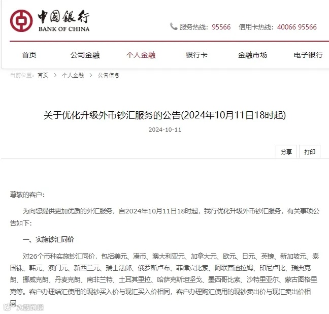 10月11日,中国银行宣布,优化升级外币钞汇服务。自10月11日18时,对26个币种实施钞汇同价。客户办理结汇使用的现钞买入价与现汇买入价相同,客户办理购汇使用的现钞卖出价与现汇卖出价相同。对上述币种免于收取钞汇转换价差,即客户办理现汇账户存取现钞、现汇账户与现钞账户之间划转资金、现钞账户办理跨境汇款等涉及外币钞汇性质转换的交易时,由于实施钞汇同价而免于收取钞汇转换价差。