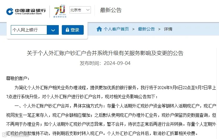 9月4日,建设银行发布关于个人外汇账户钞汇户合并系统升级有关服务影响及变更的公告。建行表示,该行存量个人活期外汇现钞户资金等额转入活期现汇户,之后默认使用现汇户办理外汇业务。个人外汇钞汇户合并后,取消钞汇折算相关收费。建行明确,该行柜面渠道和电子渠道实施个人现钞结汇和现汇结汇同价、个人外汇买卖现钞和现汇交易同价;购汇和现汇结汇报价不变,现汇买入和卖出报价不变。