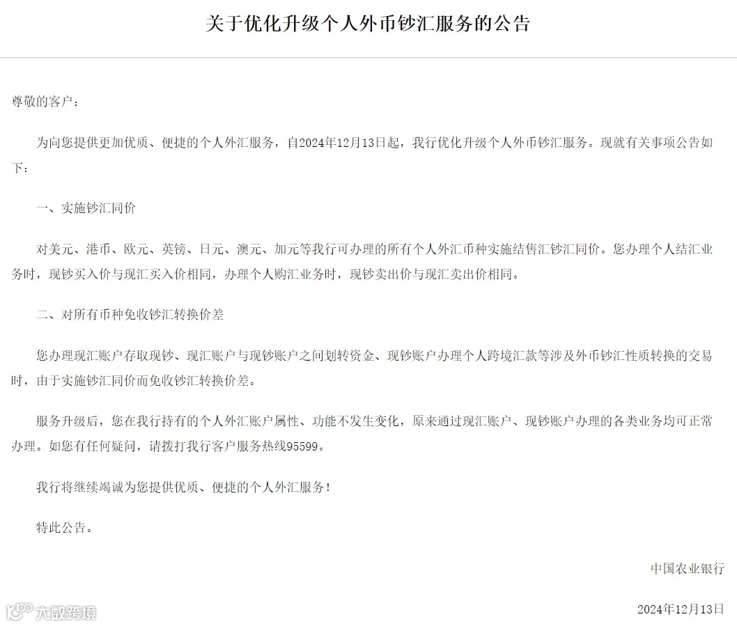 12月13日,中国农业银行在官网发文称,自2024年12月13日起,优化升级个人外币钞汇服务,升级版服务的内容主要包括实施钞汇同价、对所有币种免收钞汇转换价差等。