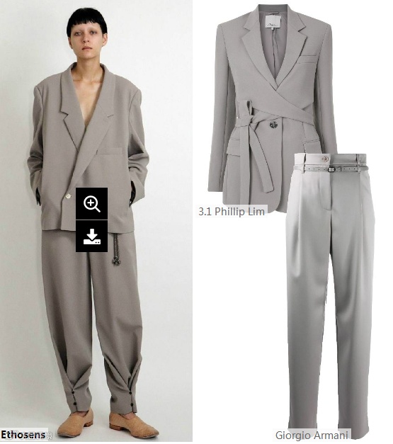 低调哑光质地和舒适易打理等特点的哑光仿醋酸面料,适合打造中性跨季风格西服套装,可采用纽扣式束口裤脚、中间衣层、腰带等的设计,穿着者可自行搭配调整。
