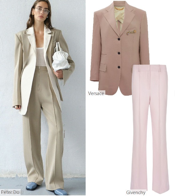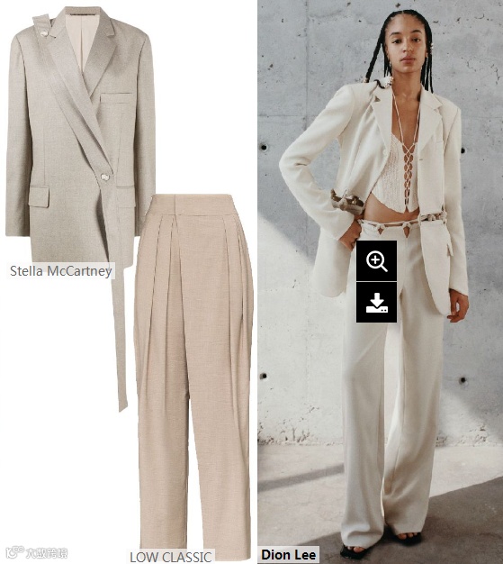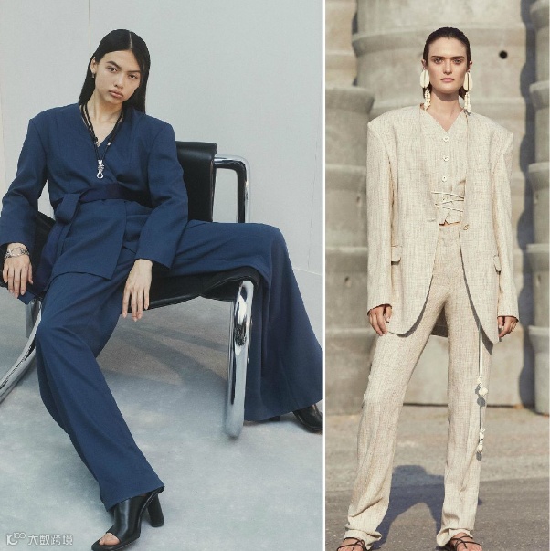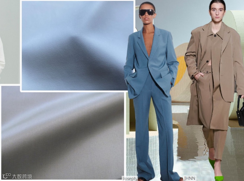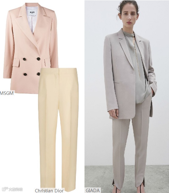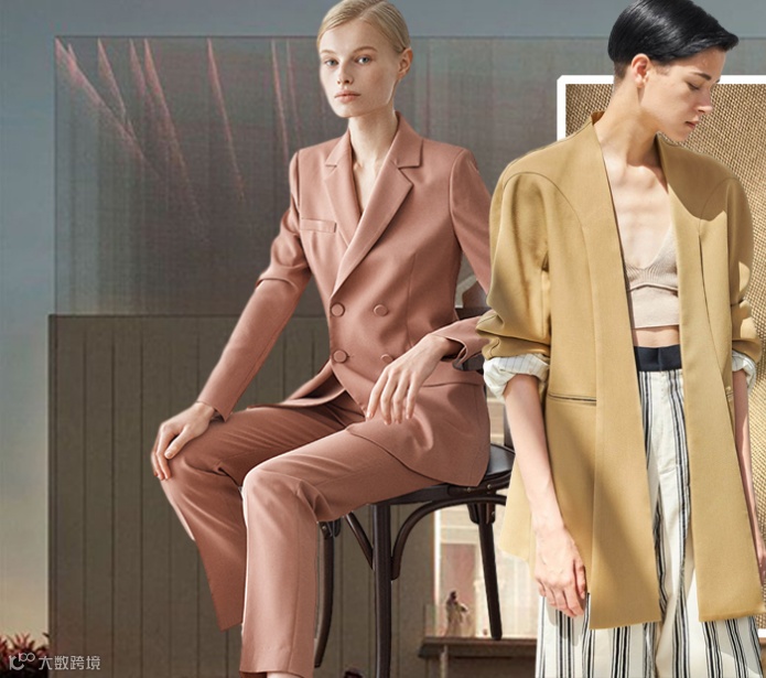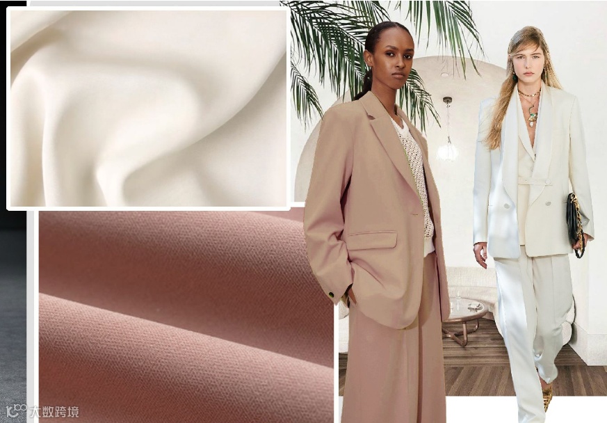 2022春夏女装西装套装,面料可选用能够兼顾休闲风格和正式通勤着装的柔软触感面料。如精致棉麻、双面四面弹酸等面料,在柔和挺括廓形中均等出现。