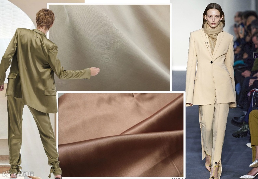 哑光仿醋酸面料,可选用二醋酸原料与涤纶结合,低调哑光质感、手感舒适、抗皱等特点,可与三醋酸面料媲美,且更具性价比、更易打理。面料经过加捻使得成型挺括,适合打造正式与休闲皆宜的西服套装单品,极具有商业潜力。