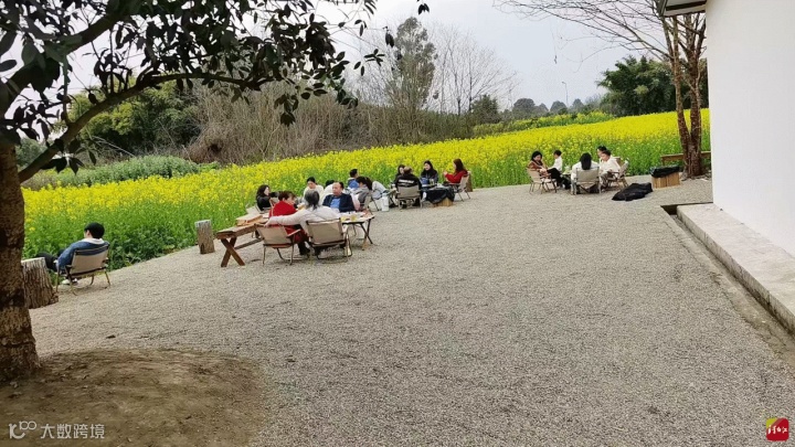 咖啡馆的一面外墙,是游客的“留言墙”,大家在这里写下了对乡村的憧憬和祝福。地上铺满了碎石,游客坐在这里喝茶、聊天,望眼周围的油菜花,真有一种心旷神怡的感觉。