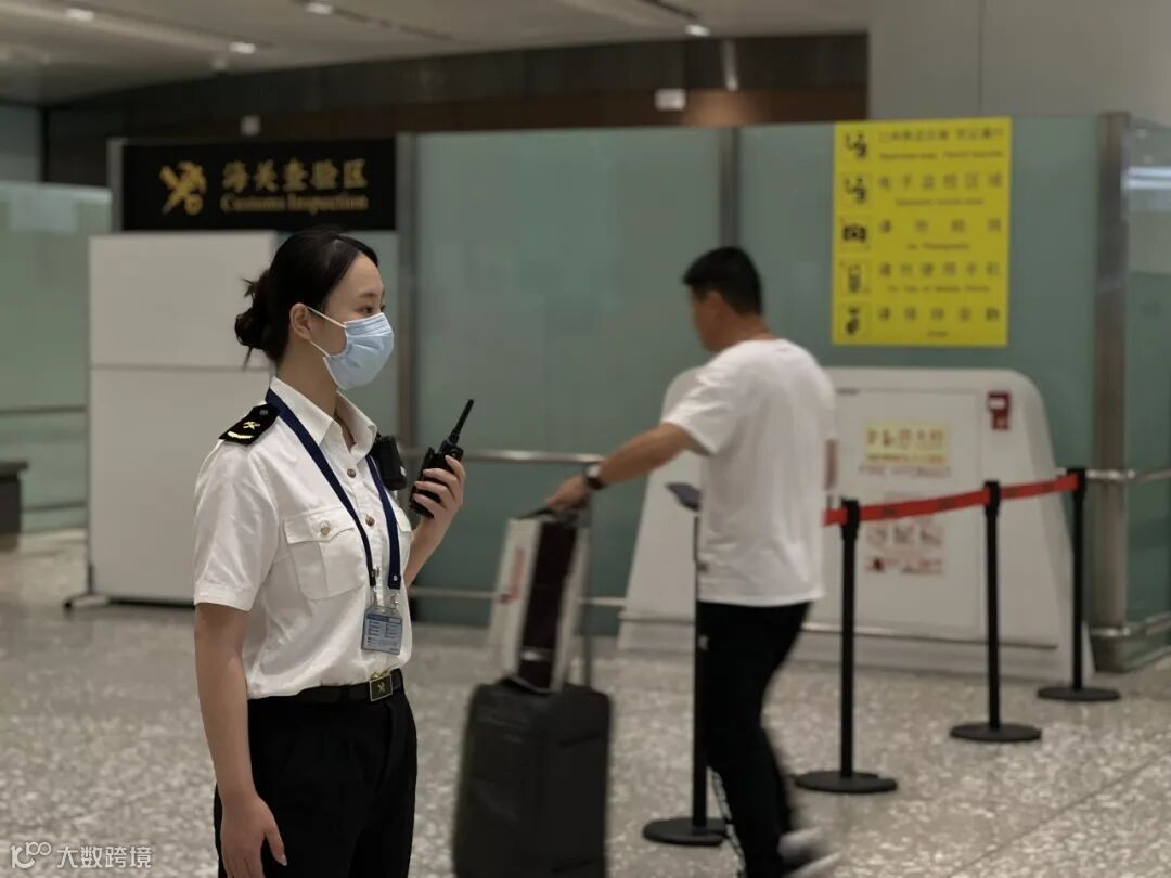 9月29日6时28分,大兴机场海关关员李金航于进境旅检现场进行旅客分流。摄影:王思馀