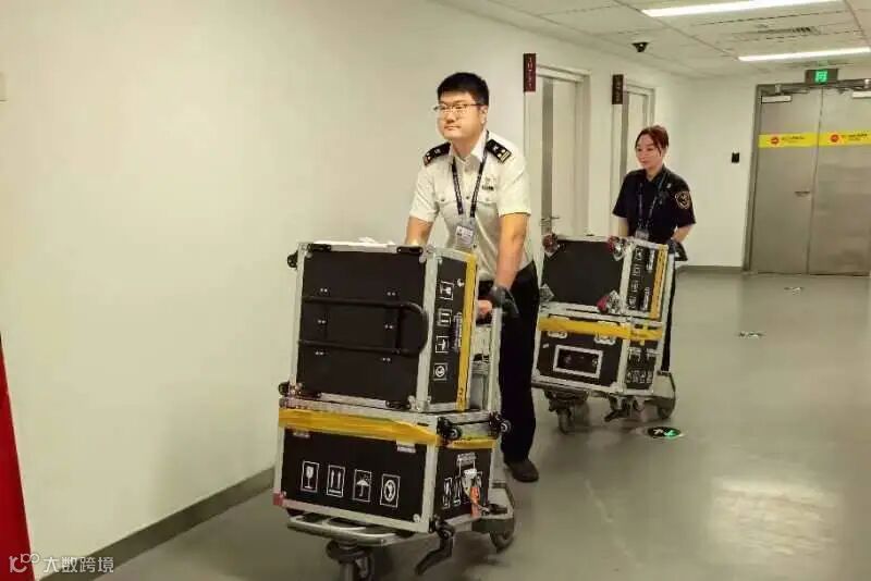 9月29日14时30分,首都机场海关关员王李梁、张飚于BGS库区查验出口货物。摄影:韩东琪