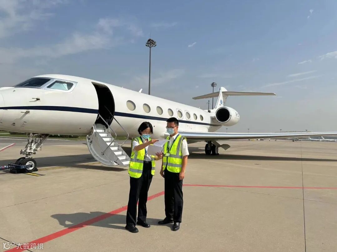 9月29日10时50分,首都机场海关关员鲁洁、贾少伟对公务机进行登临监管。摄影:陈晓雪