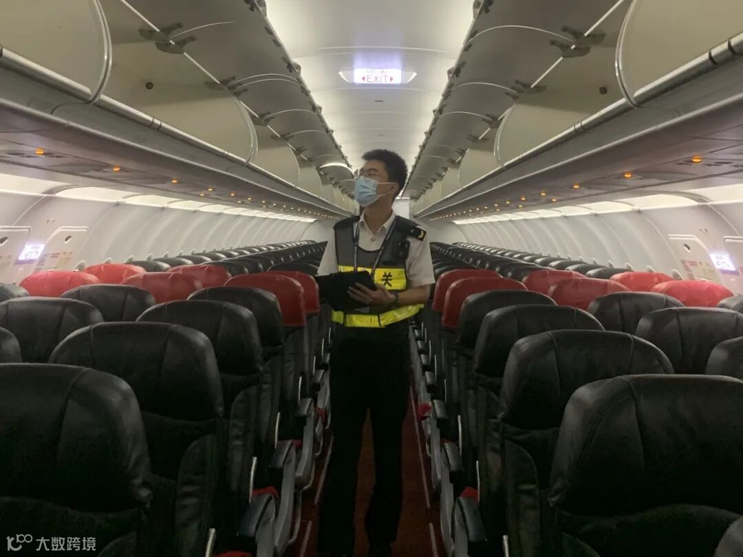 9月29日0时45分,大兴机场海关关员张曜于机舱内开展航空器登临检疫。摄影:张博。