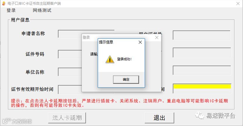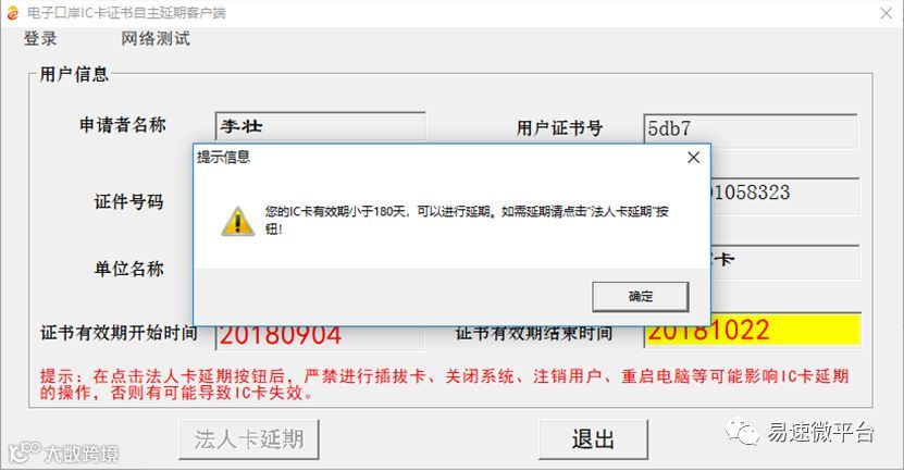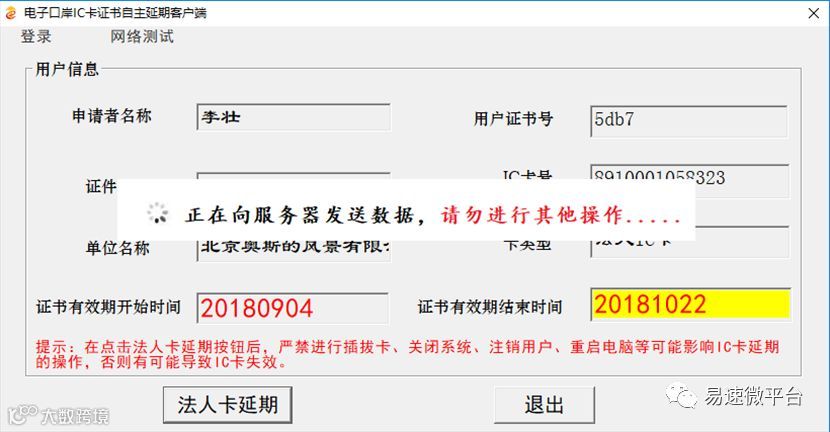 系统开始对IC卡进行延期操作,系统操作期间用户严禁进行插拔卡、关闭系统、注销用户、重启电脑等可能影响IC卡延期的操作,否则有可能导致IC卡失效。如下图所示: