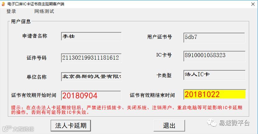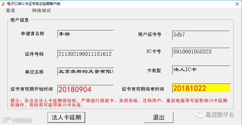 4、登录客户端后,系统会显示IC卡主要信息,并会初步判断IC卡是否可以延期,如IC卡为法人卡,则可以进行延期操作。如下图所示: