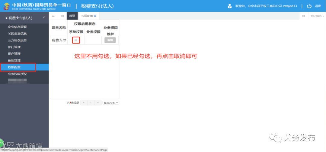 答:用户权限功能新上线,很多用户不了解如何使用,如果之前的功能已经能满足业务需求,那么是用不到这个新功能的,这里就不需使用“权限设置”。如下图所示,我们默认是不勾选这个选项的,如下图。(如果有启用的需求请详细阅读《中国国际贸易“单一窗口”标准版用户手册(税费支付)》文档中4到8章进行相关配置)