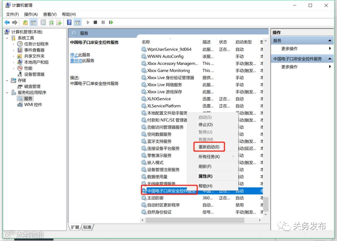 如果已安装客户端控件,请用户右键点击桌面“我的电脑”-“管理”-“服务和应用程序”-“服务”,右键点击“中国电子口岸安全控件服务”选择“重新启动”,几秒钟后会提示启动成功,此时拔下读卡器USB口再插上就可以再用卡登陆