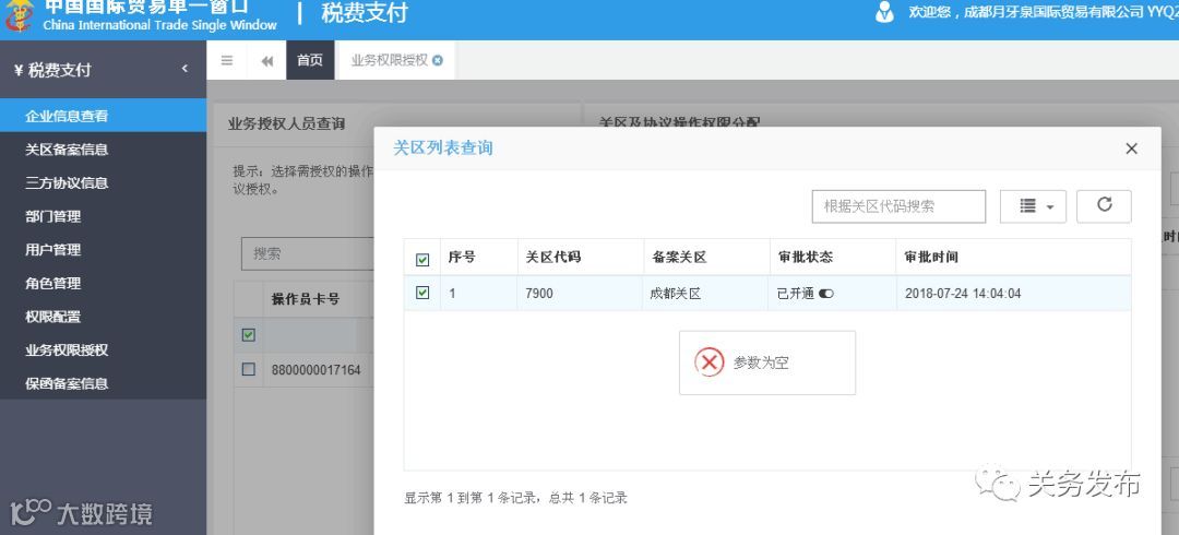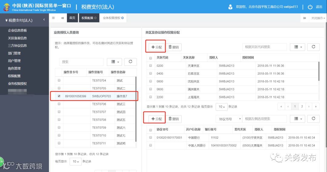 上一步确认没有勾选后进入到“业务权限授权”,给有卡操作员分配可操作的关区和协议,操作员只能看到已分配的关区下的税单数据和已分配的三方协议