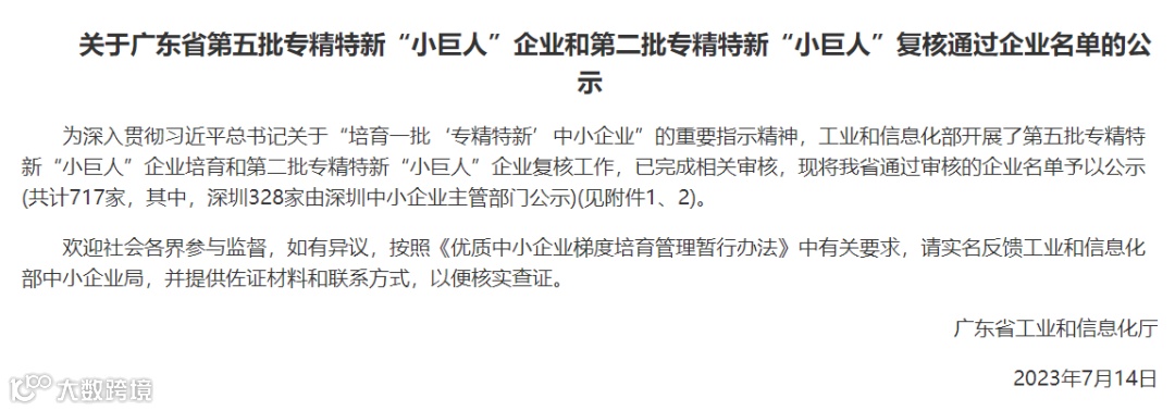 近日,省工业和信息化厅发布了《关于广东省第五批专精特新“小巨人”企业和第二批专精特新“小巨人”复核通过企业名单的公示》。