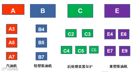 欧洲汽车制造商协会对于车辆分类是用一个字母后面加数字来表示级别的,其中字母代表“A"汽油发动机,"B"轻型柴油机,"C"带尾气处理装置的柴油机,"E"重型柴油机。
