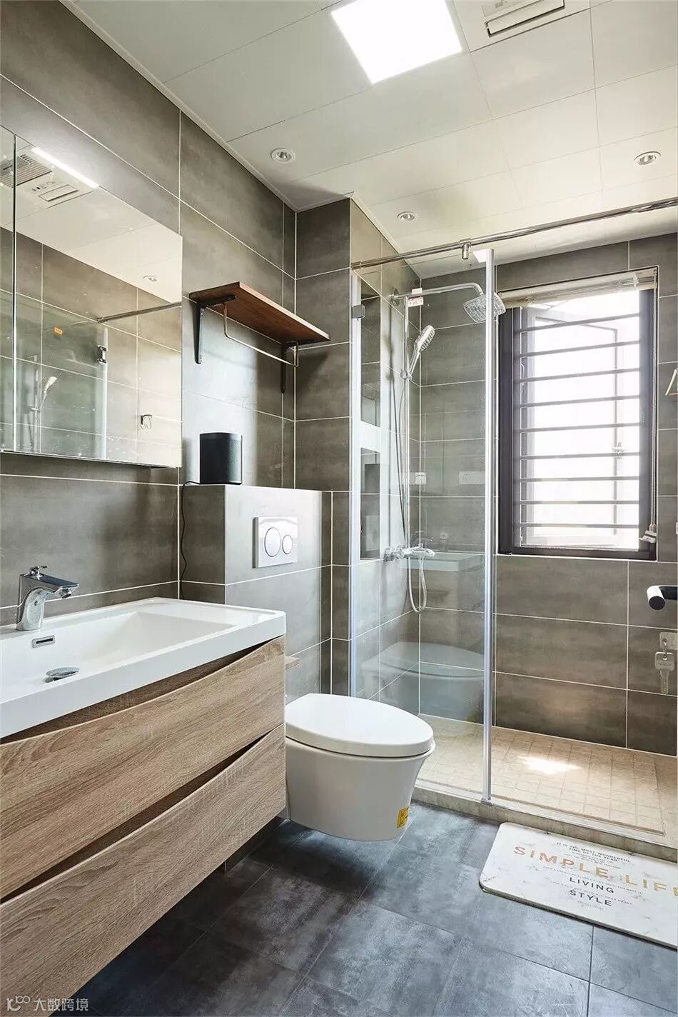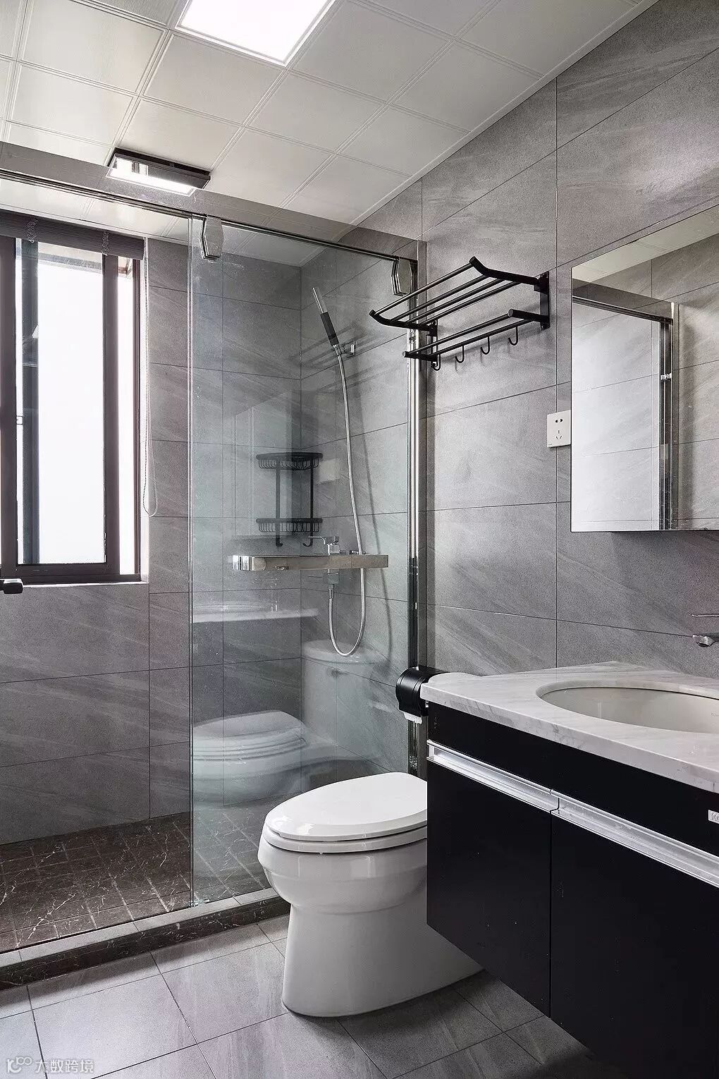 而一些比较方正的卫生间,一字排开的淋浴房、马桶、洗手盆是空间不足的,这个时候就可以以三角形的分布,这样在有限的空间内,同样可以保持通畅实用的功能。