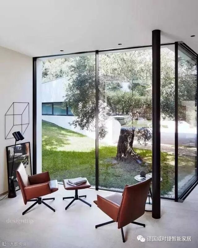 建筑是凝固的艺术,而透过落地窗,就可以感觉到室外风景的四季变换,在凝固的空间中感受流动,能带给人十分微妙的感觉。